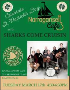 SHARKS COME CRUISIN WILL PERFORM IRISH SONGS AND SEA SHANTIES FROM 4:30-6:30 PM. GREAT FOOD, GREEN BEER, AND SONG WILL FILL THE GANNY!